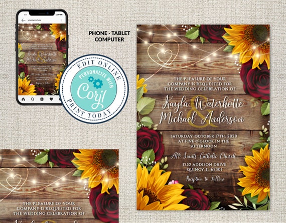 Wedding Invitation Template Rustic Wood With Sunflowers & Etsy